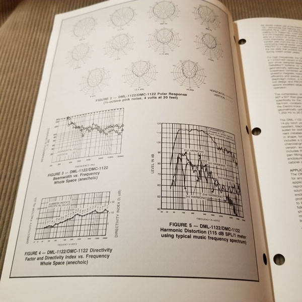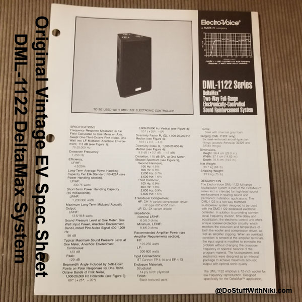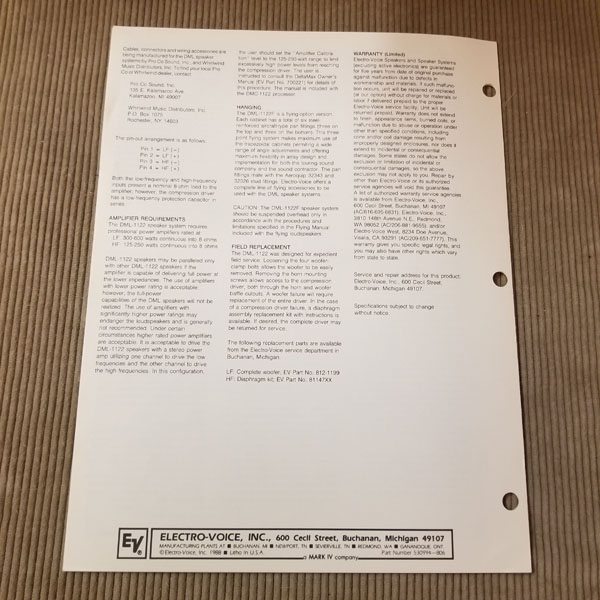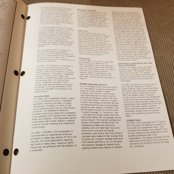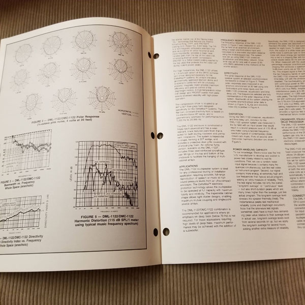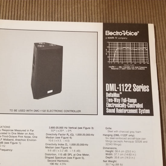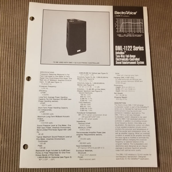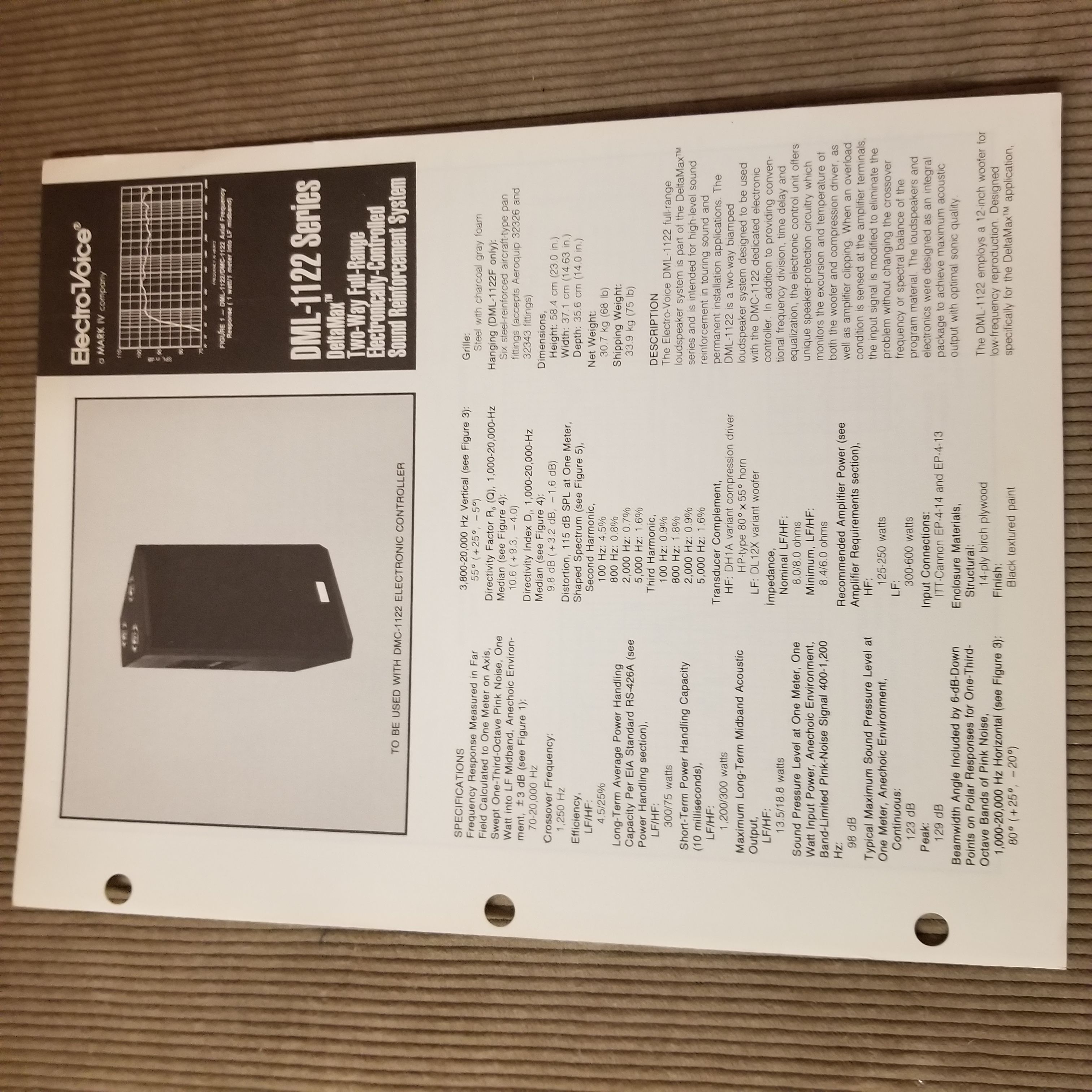 Original Vintage EV Spec Sheet DML-1122 Series DeltaMax Two-Way Full-Range Electronically Controlled Sound Reinforcement System, Part# 530994-806, 2 pages. Good condition.