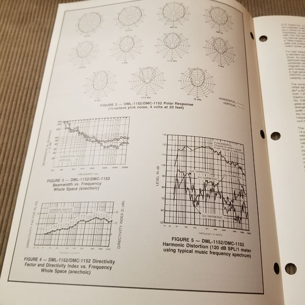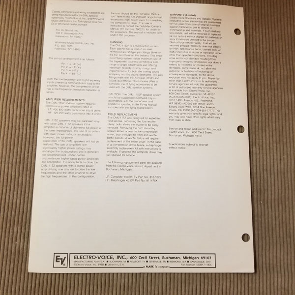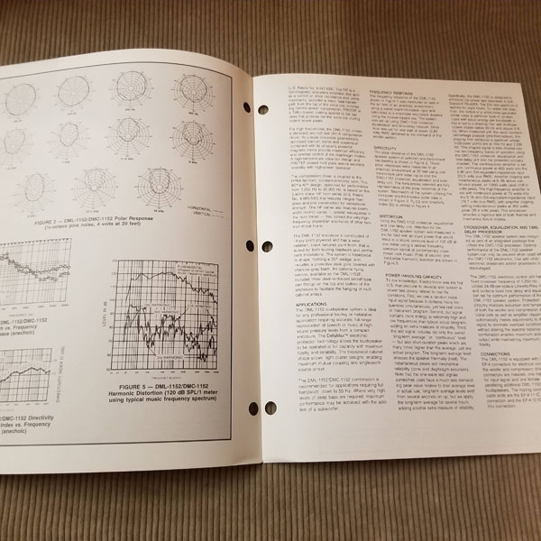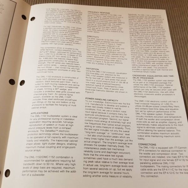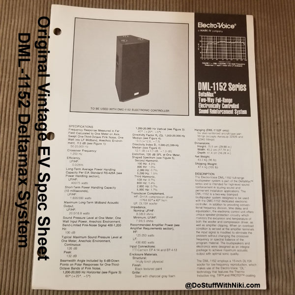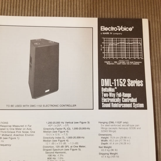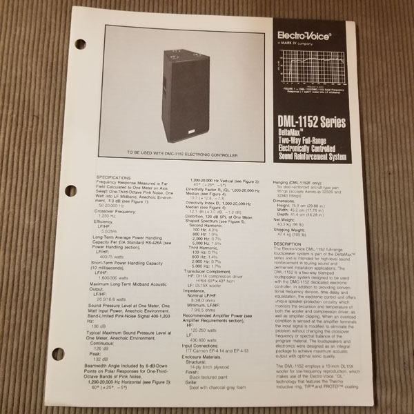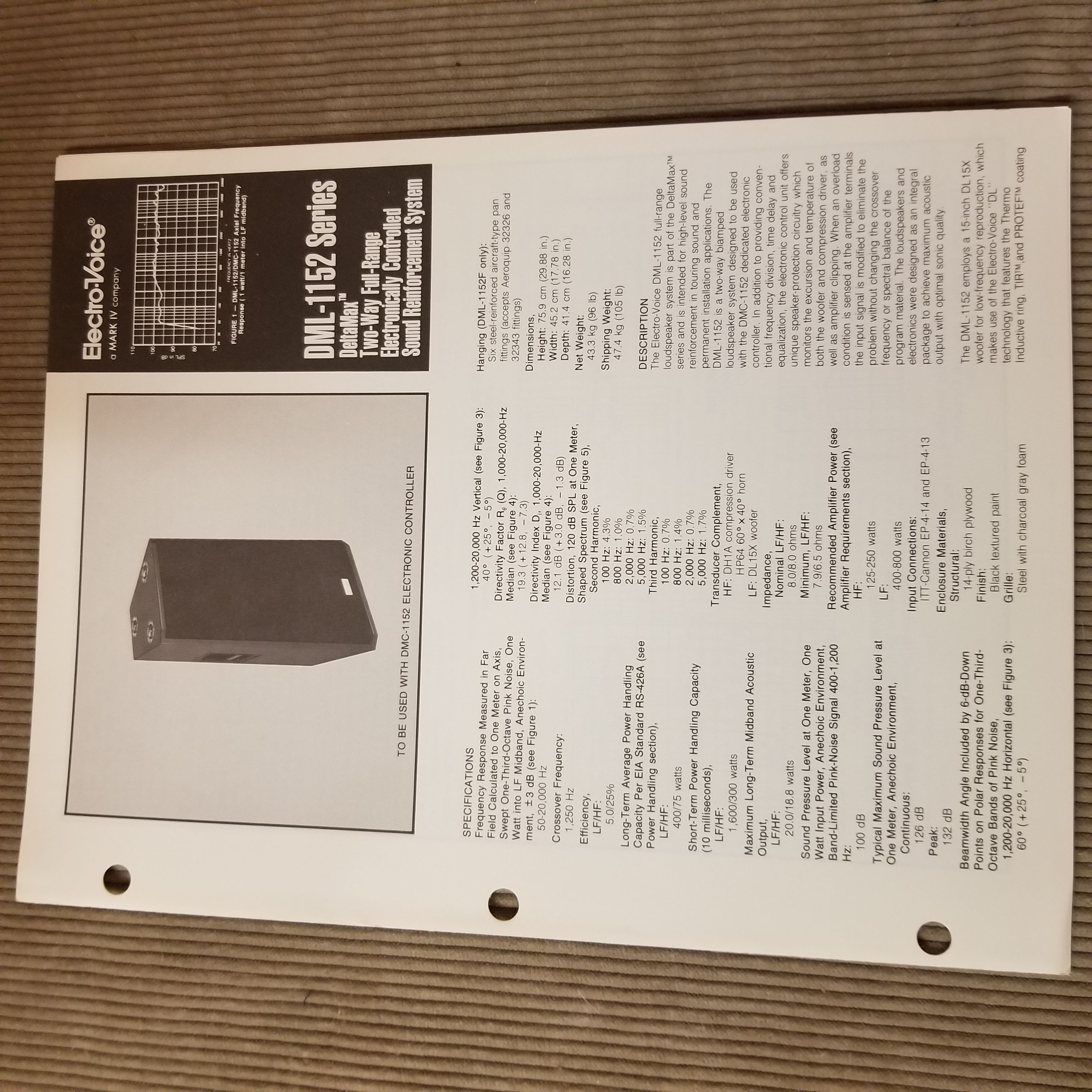 Original Vintage EV Spec Sheet DML-1152 Series Deltamax Two-Way Full-Range Electronically controlled Sound Reinforcement System, Part# 530847-806, 2 pages. Good Condition
