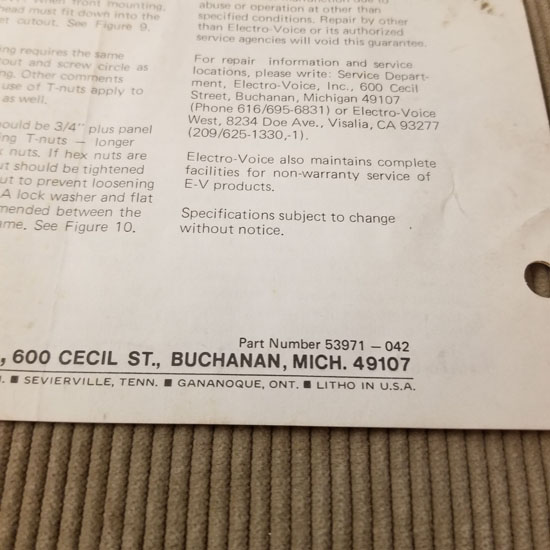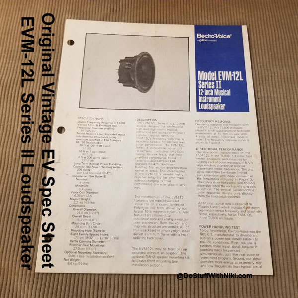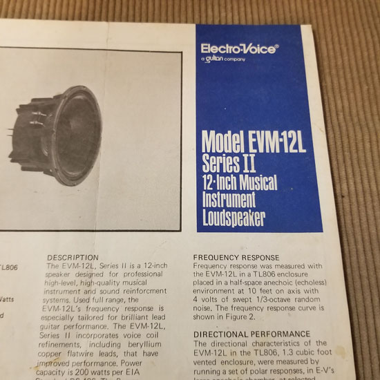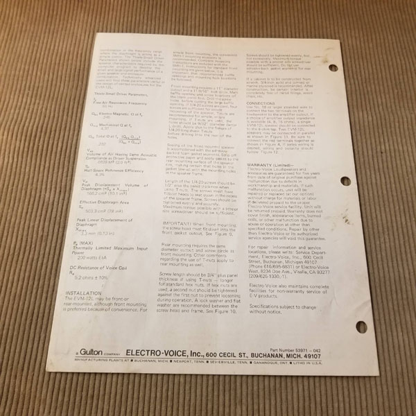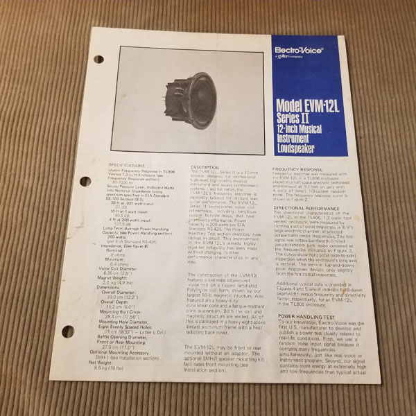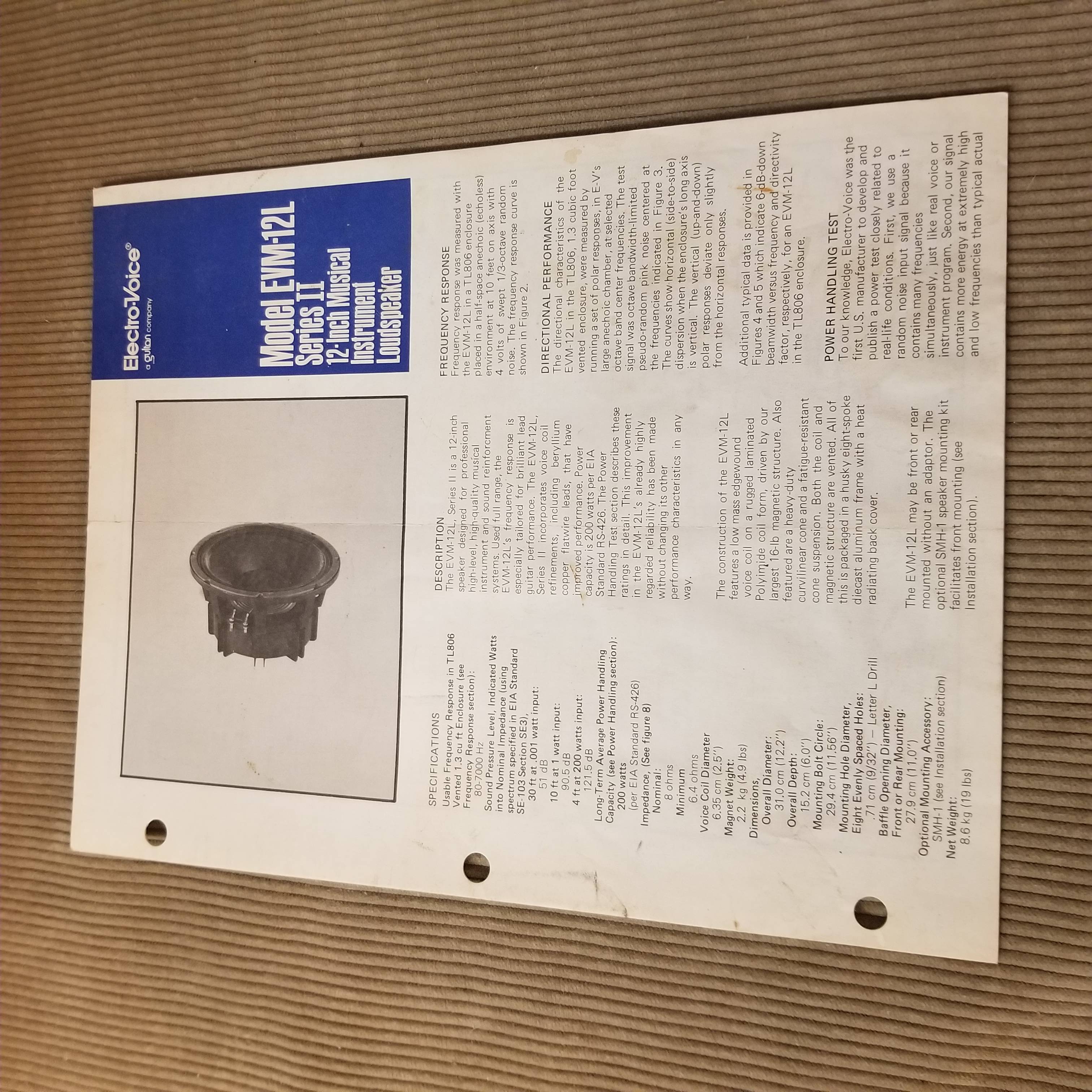 Original Vintage EV Spec Sheet EVM-12L Series II 12-inch Musical Instrument Loudspeaker, Part# 53971-042. 2 pages. 2 of these available, one pictured has center crease and some spots. the other is in good condition. First order will get the better condition one.