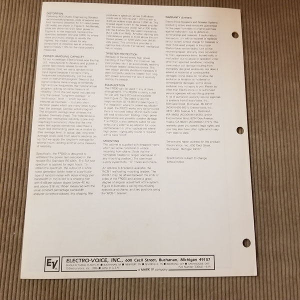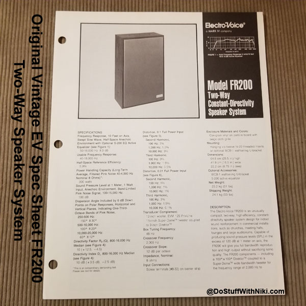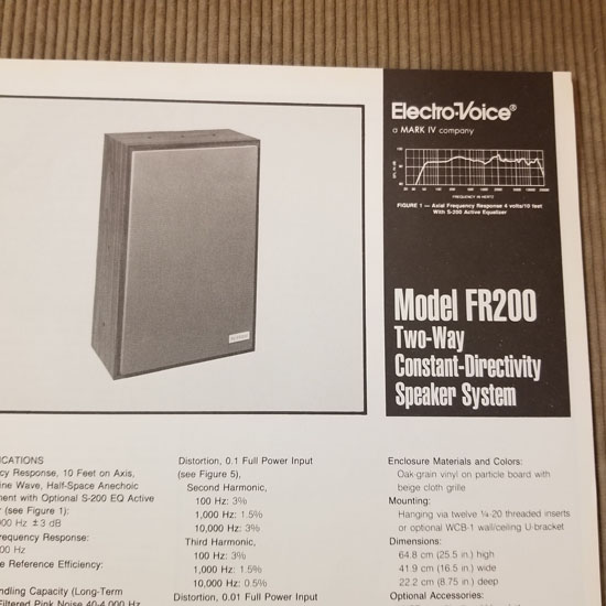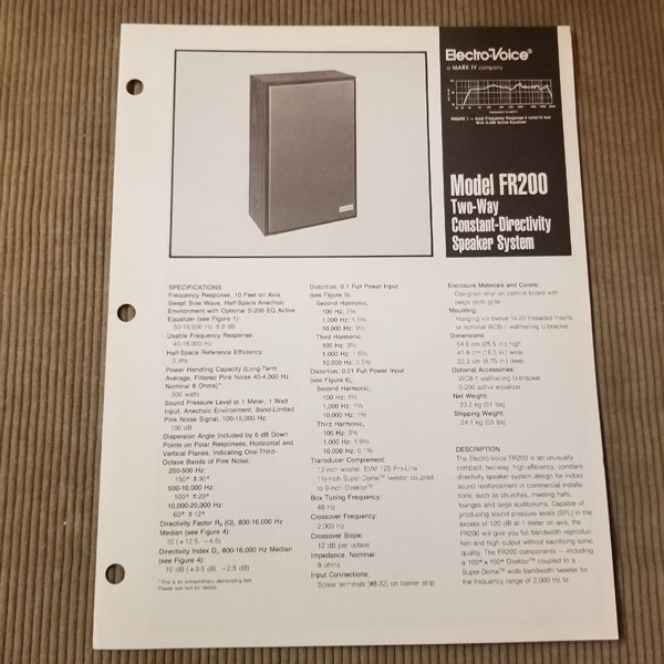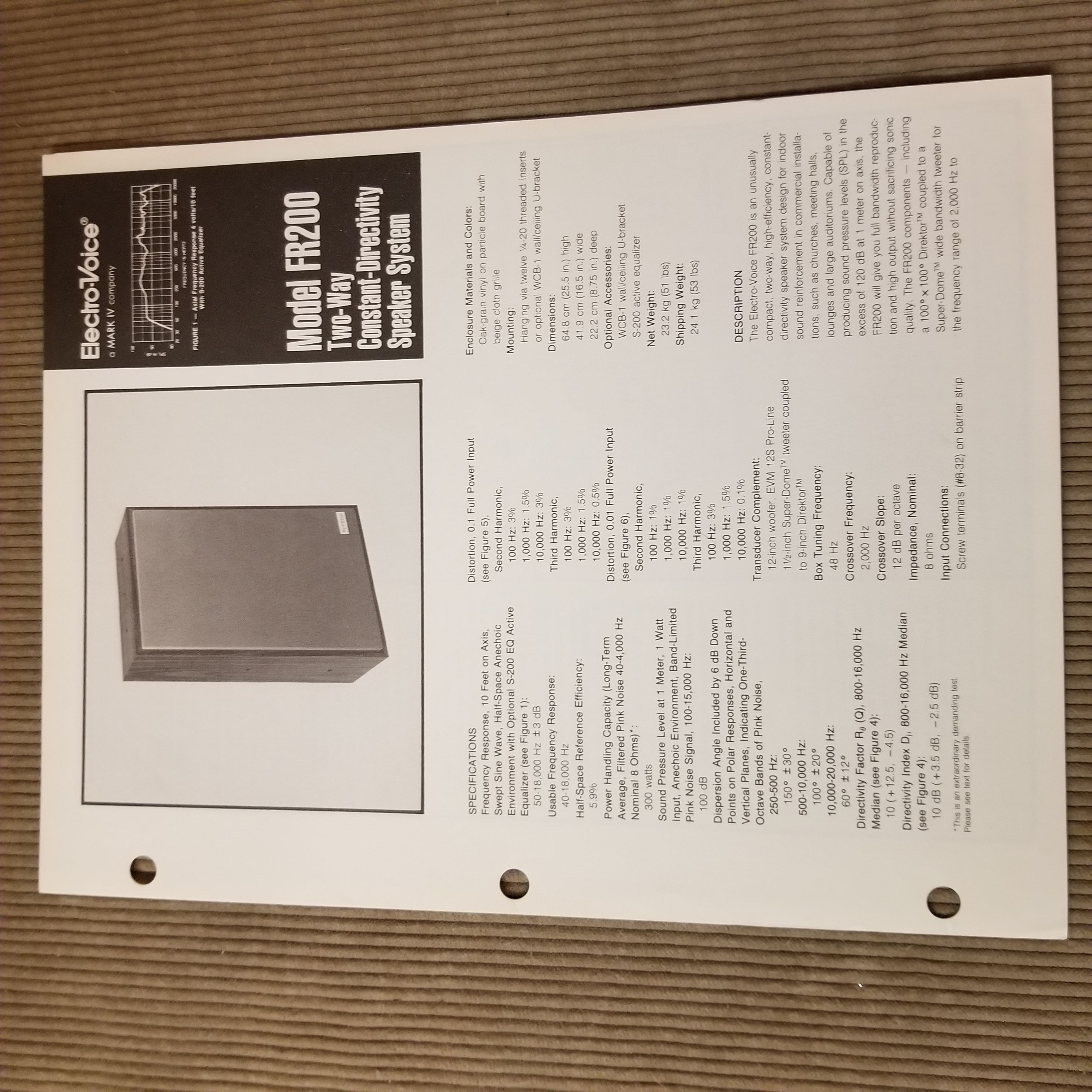 Original Vintage EV Spec Sheet FR200 Two-Way Constant Directivity Speaker System, Part# 530661-614, 2 pages.