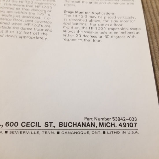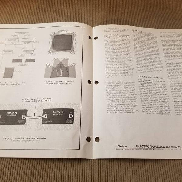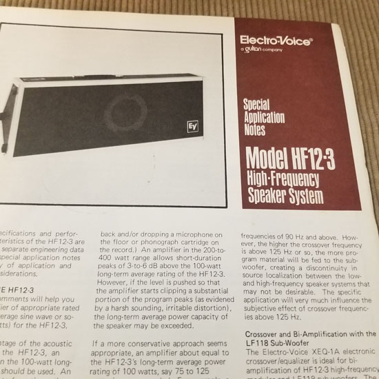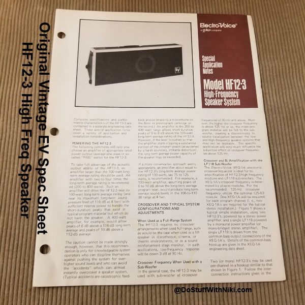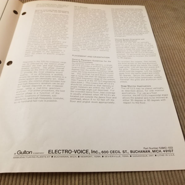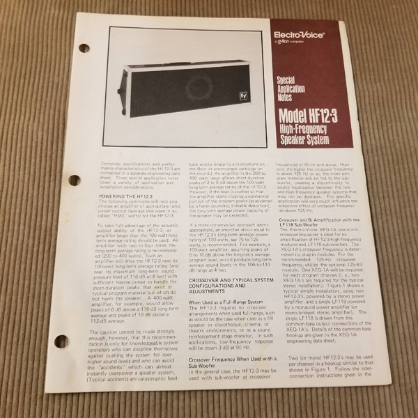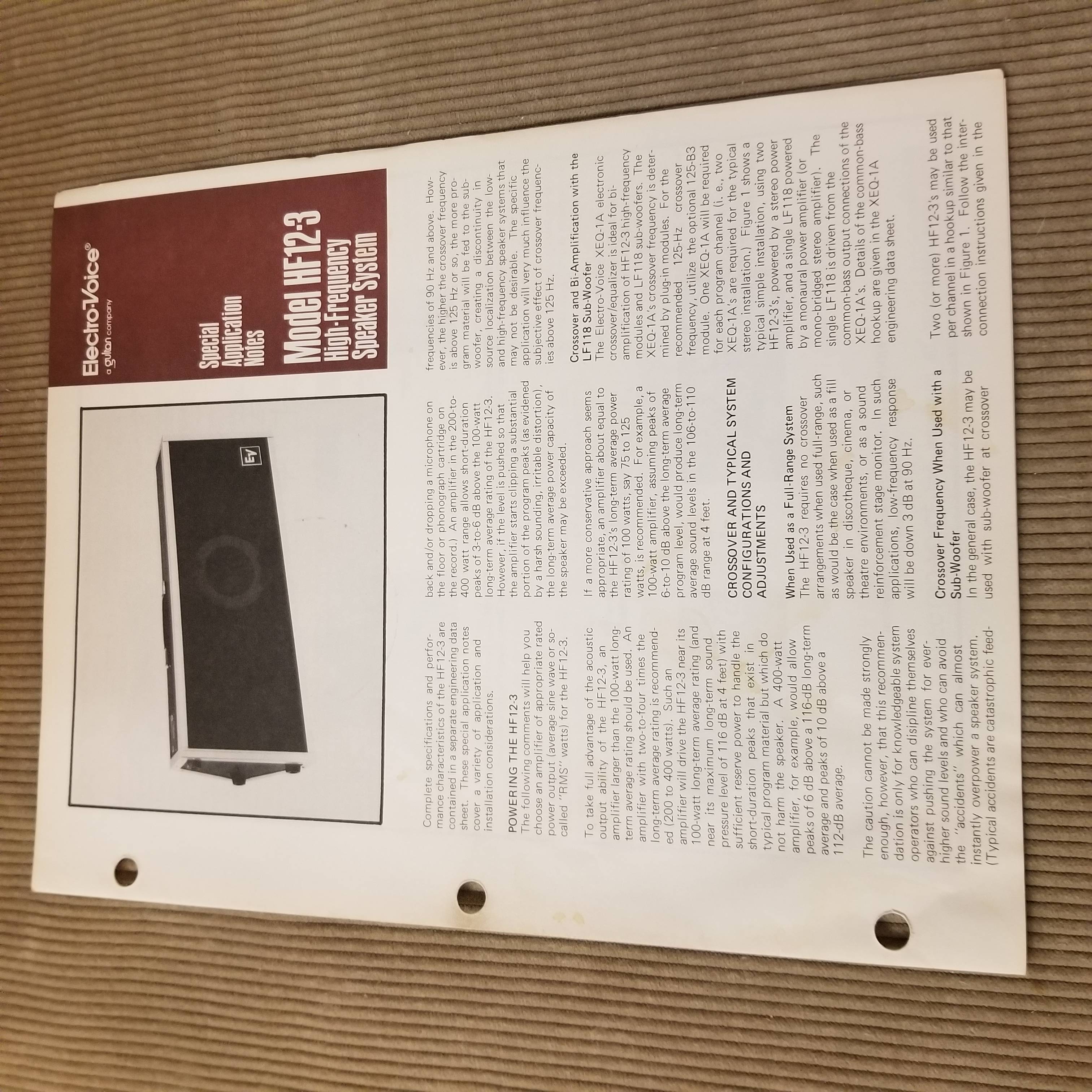 Original Vintage EV Spec Sheet HF12-3 High Frequency Speaker System, Part# 53942-033, 2 pages. Slight stain by middle binder hole but good condition.