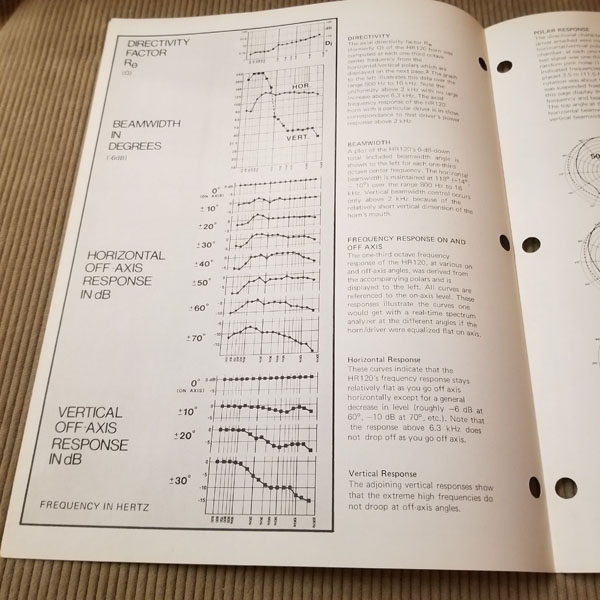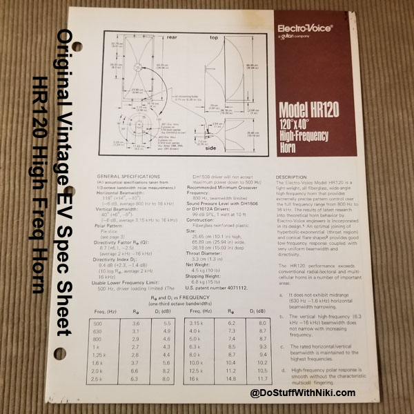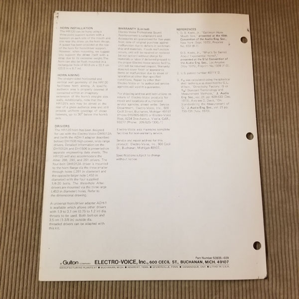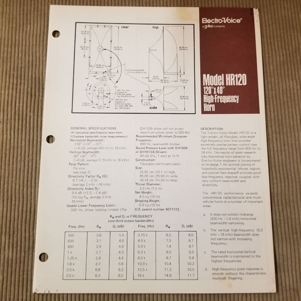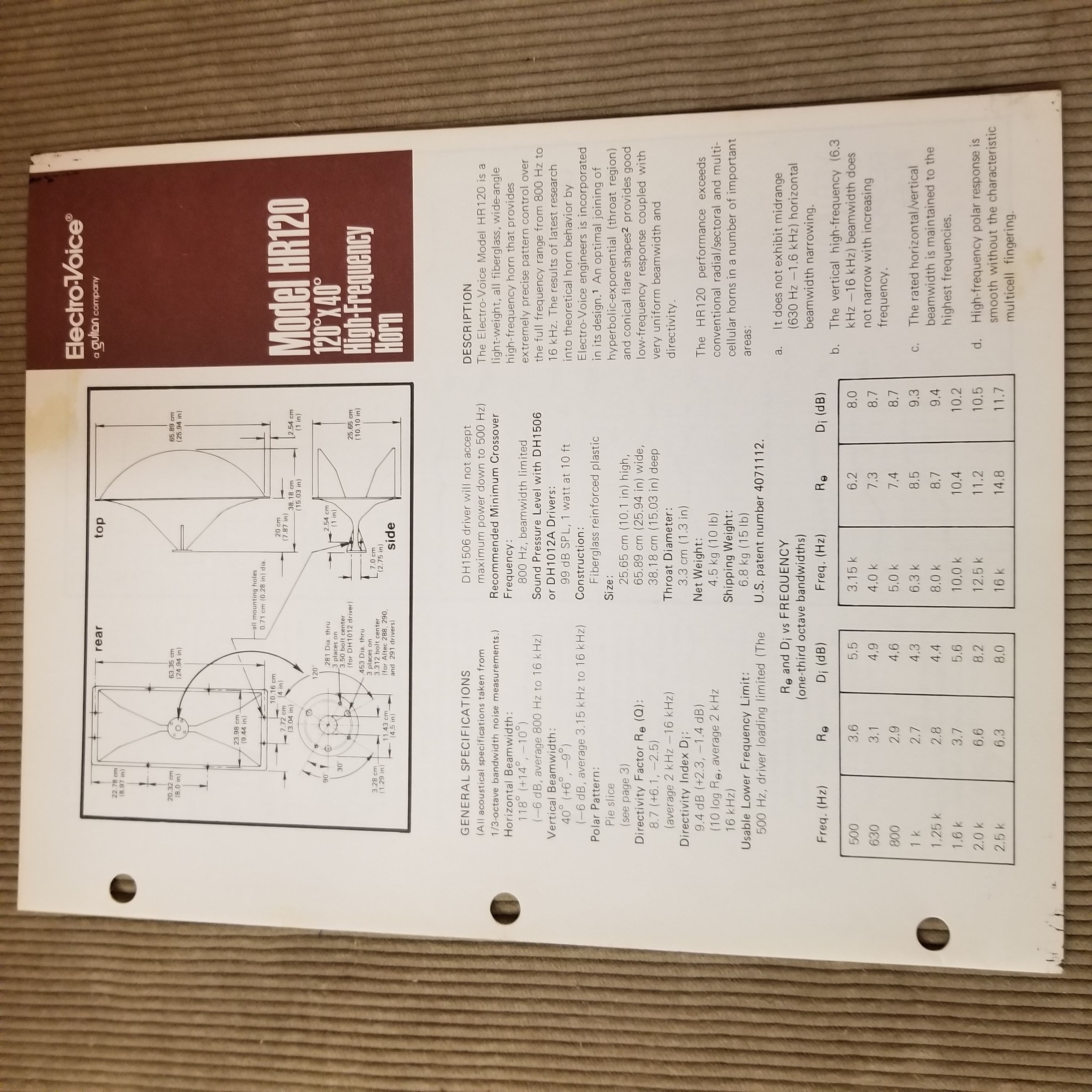 Original Vintage EV Spec Sheet Model HR120 120x40 degree High Frequency Horn, Part# 53703-929, 2 pages. Good condition