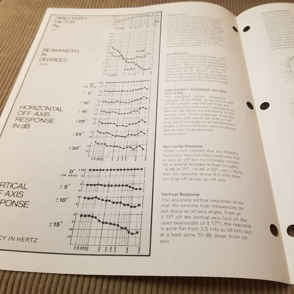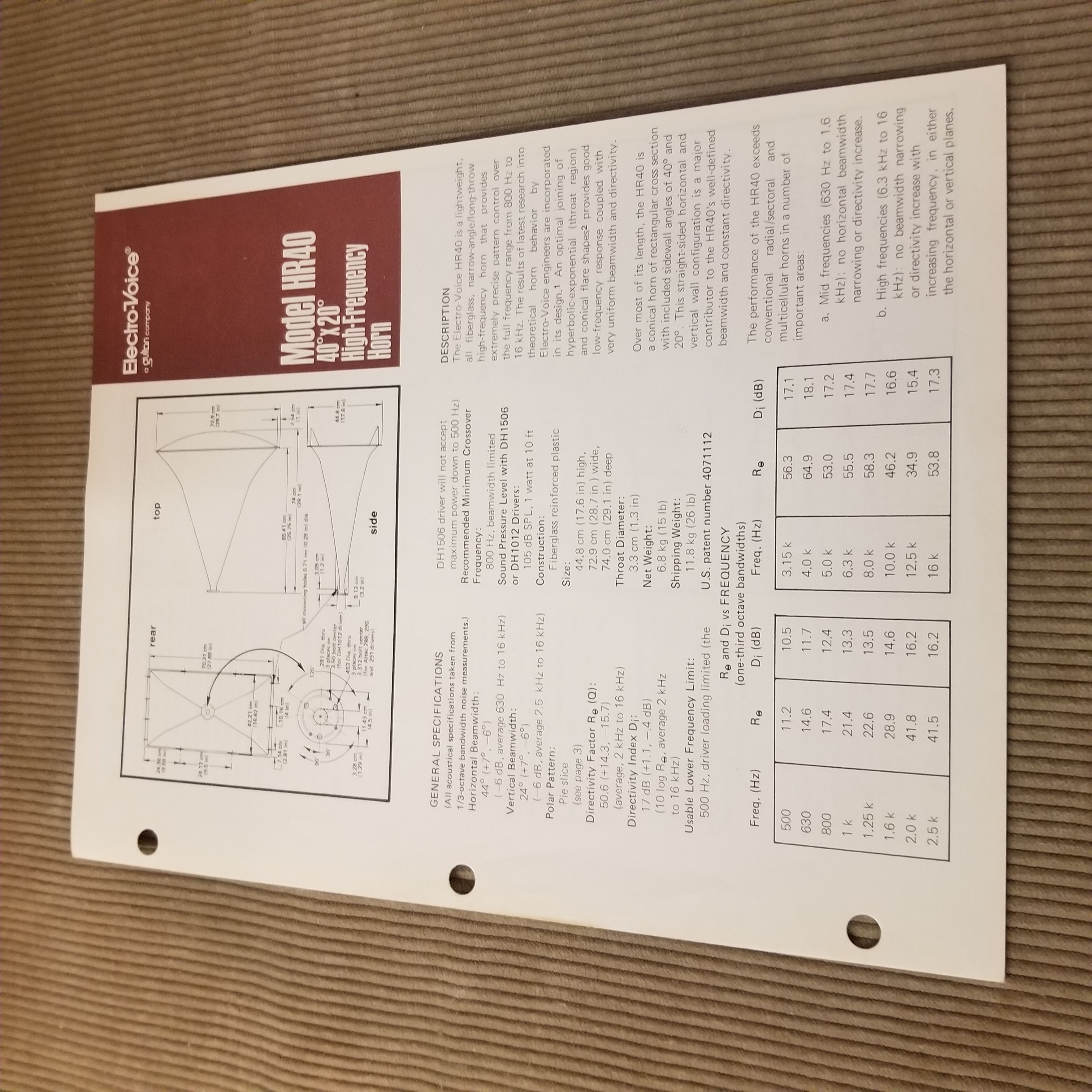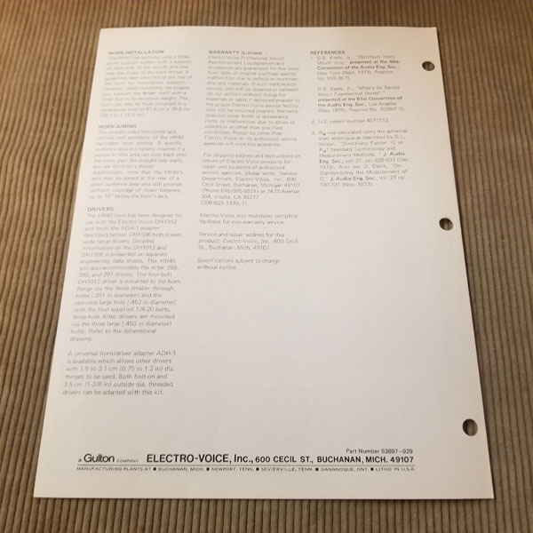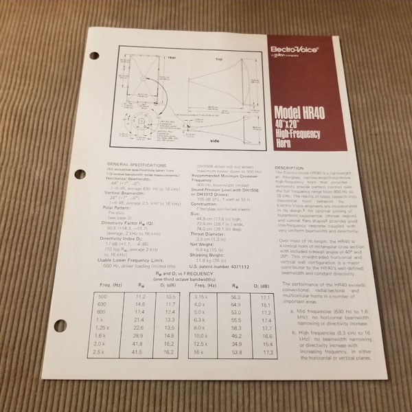 Original Vintage EV Spec Sheet Model HR40 40x20 degree High Frequency Horn, Part# 53697-929, 2 pages. Good condition