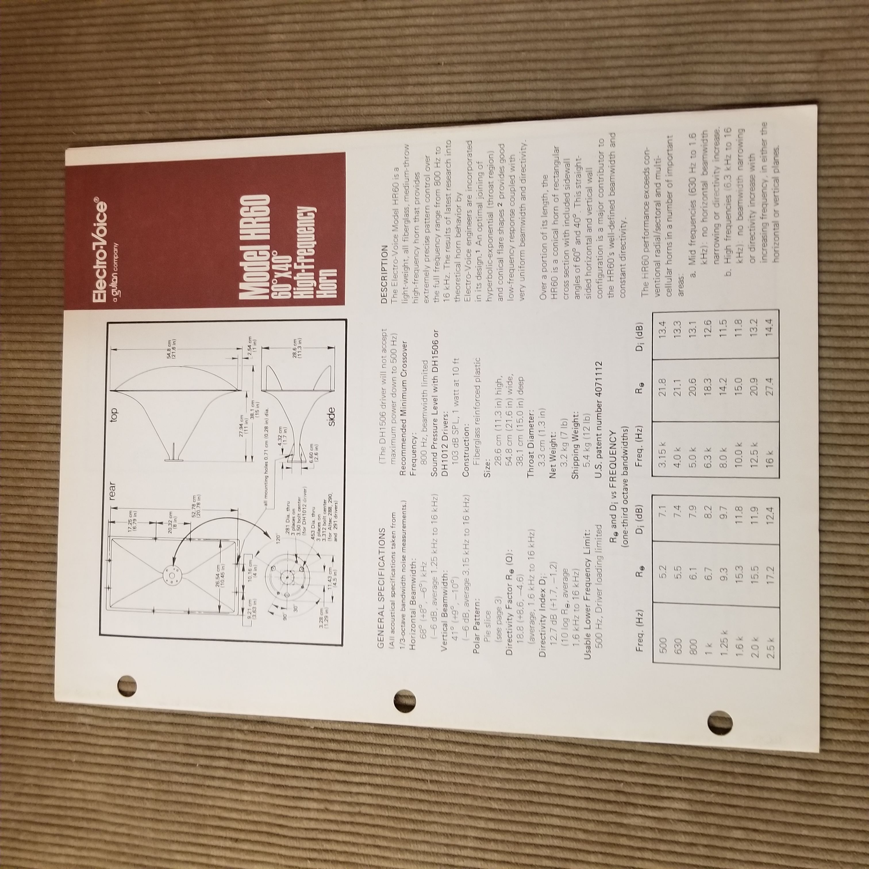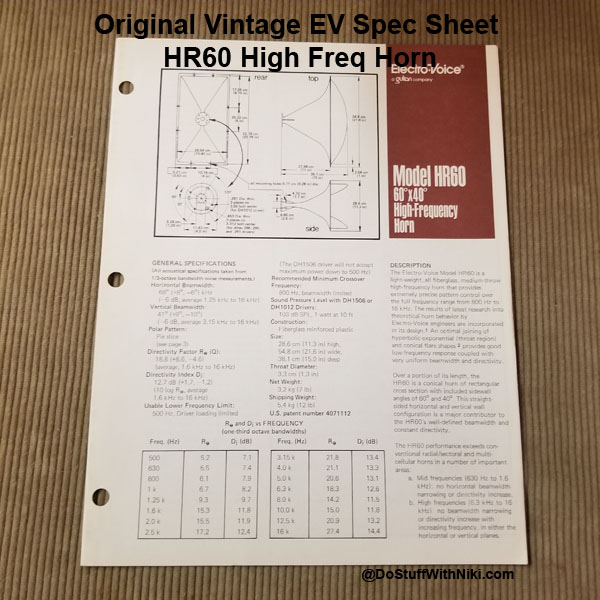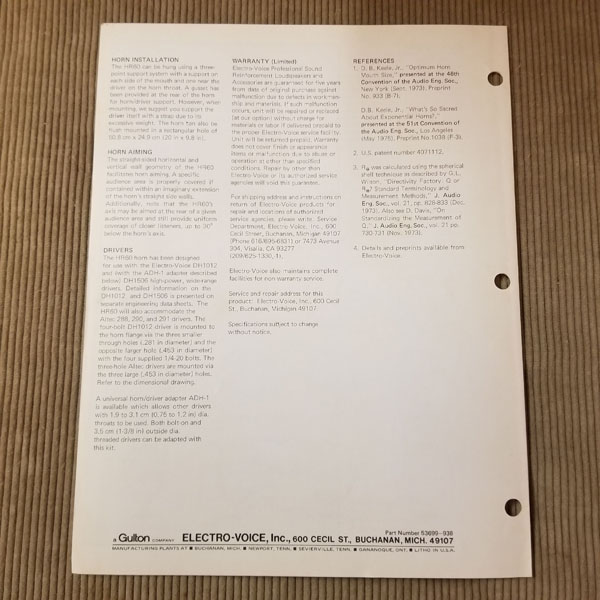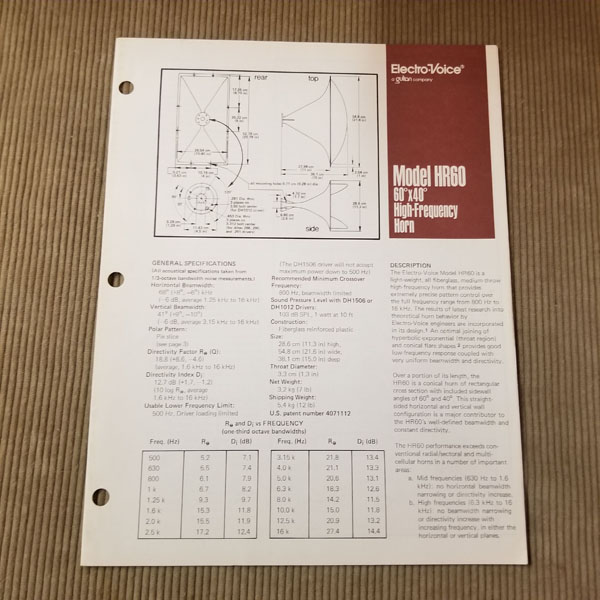 Original Vintage EV Spec Sheet HR60 60x40 degree High Frequency Horn, Part# 53699-938, 2 page.