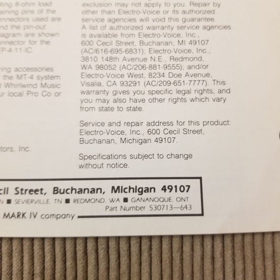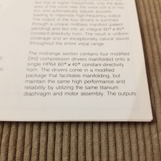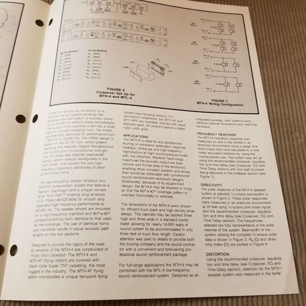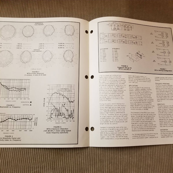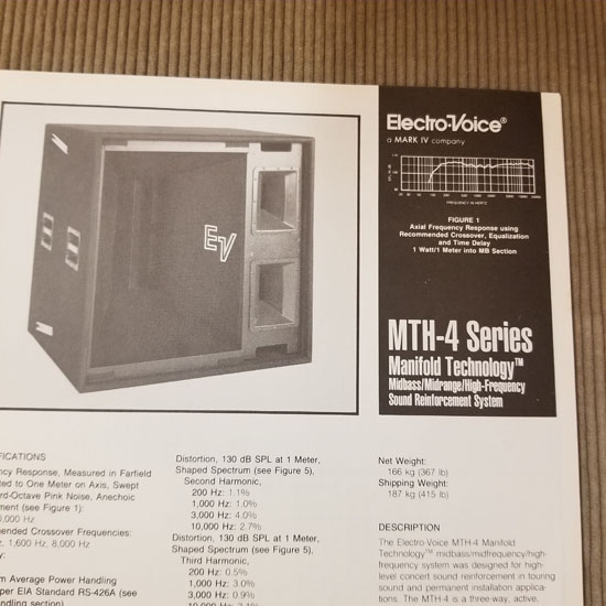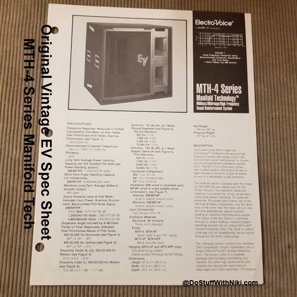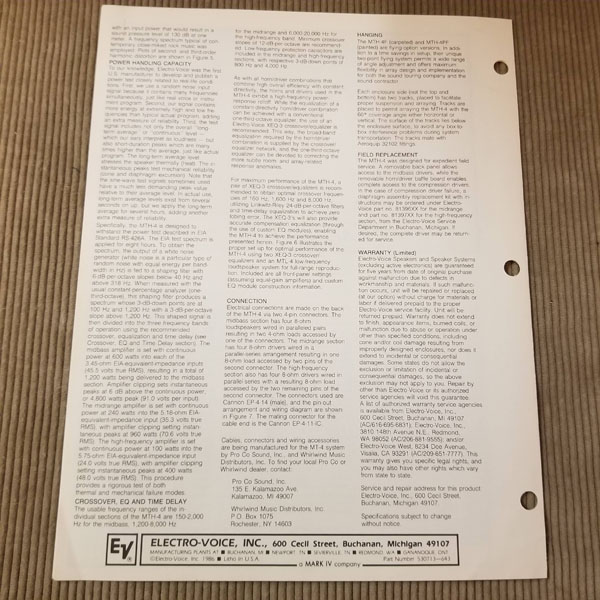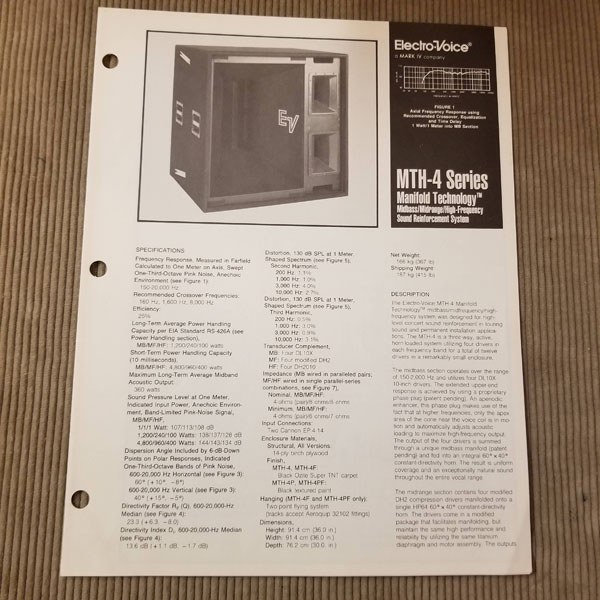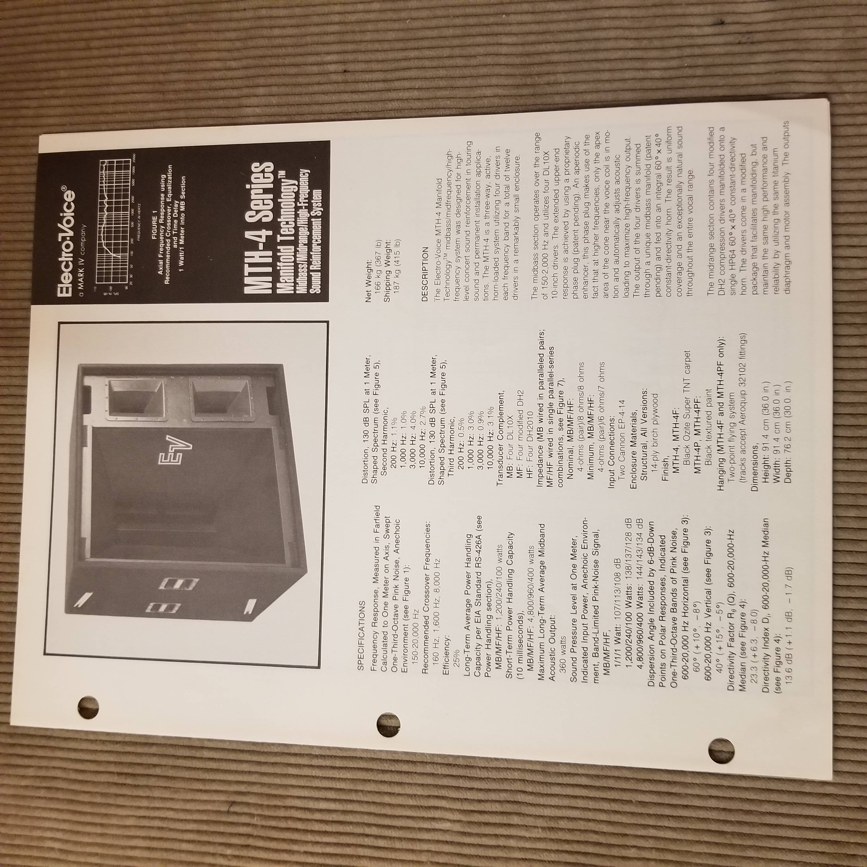 Original Vintage EV Spec Sheet MTH-4 Series Manifold Technology Midbass/Midrange/High-Frequency Sound Reinforcement System, Part# 530713-643, 2 pages. Good condition