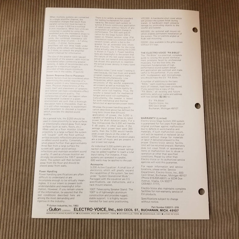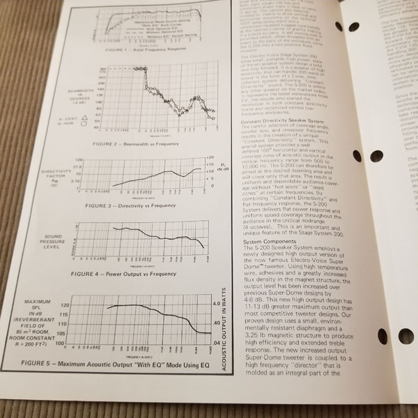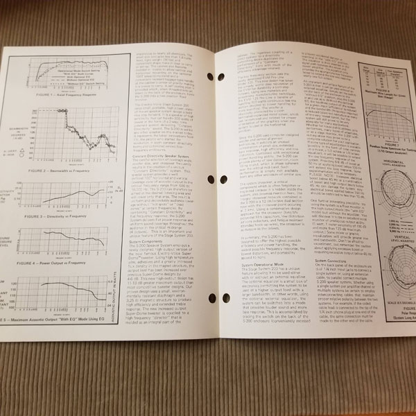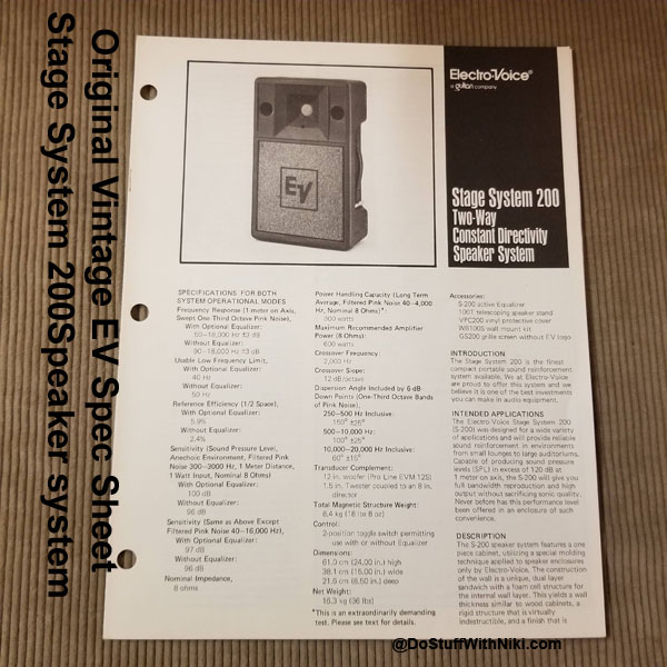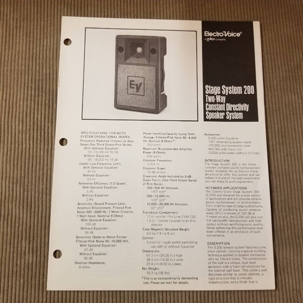 Original Vintage EV Spec Sheet Stage System 200 Two Way Constant Directivity Speaker system, 1983. Part# 530311-318, 2 pages. Very good condition.