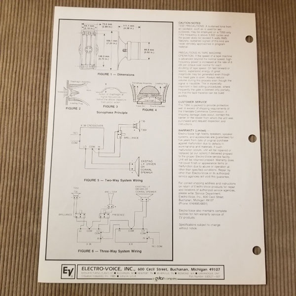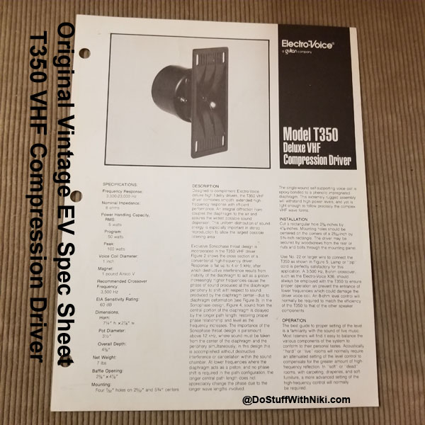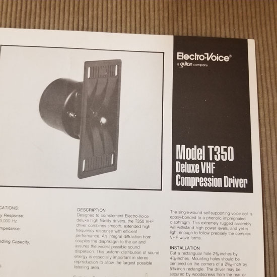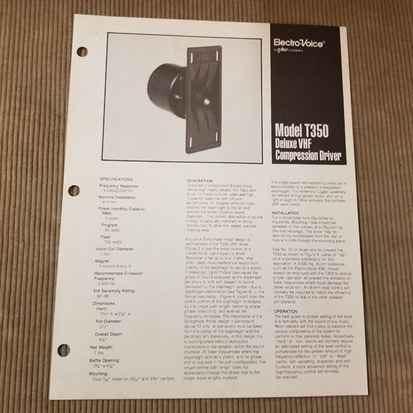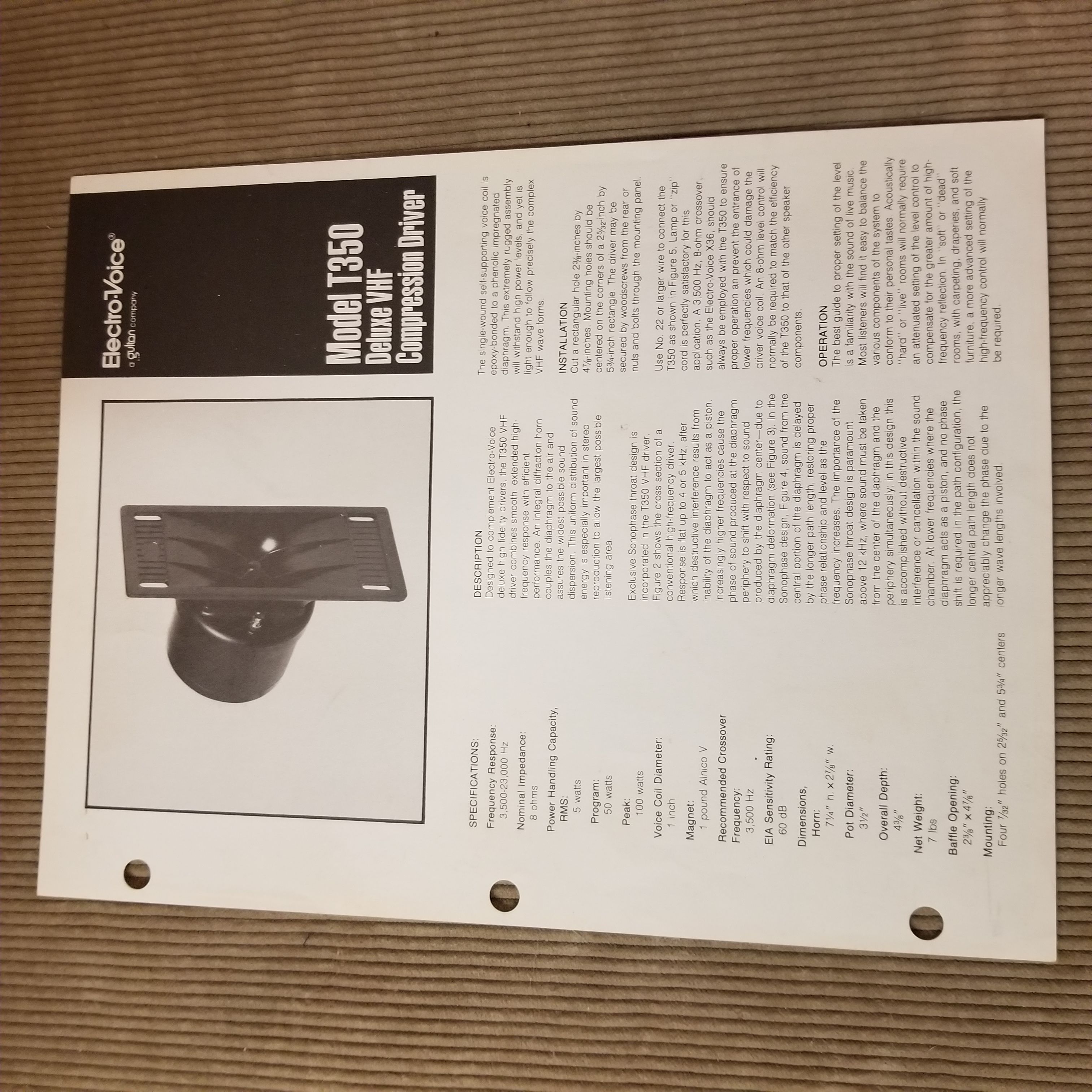 Original Vintage EV Spec Sheet T350 VHF Compression Driver
