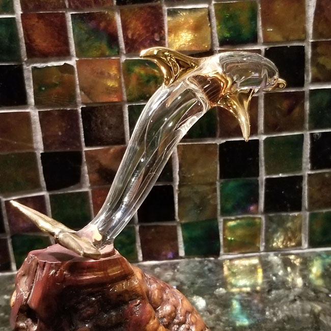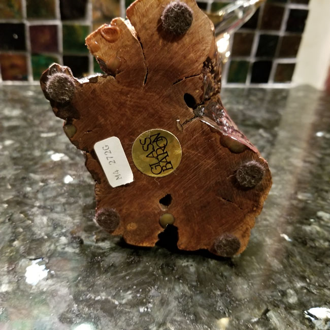 Vintage Glass Baron glass Dolphin on Manzanita wood base with 22k gold accents. 6 1/2" tall by 4" at base. Nice collectible piece.