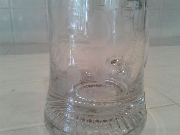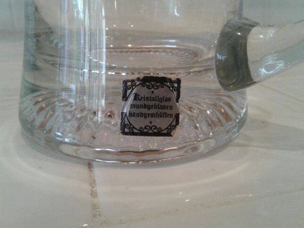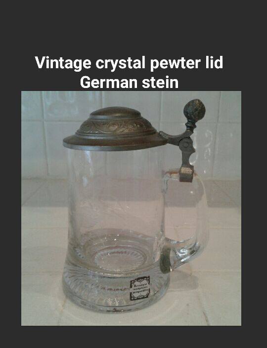This is one of our family pieces, only kept for decoration. Still has silver small sticker at bottom in German, "Kristallglas Mundgeblasen Handgeschliffen". Has beautiful etched Hops and barley design, with pewter lid. Stein is about 6" tall. Beautiful collectible piece.