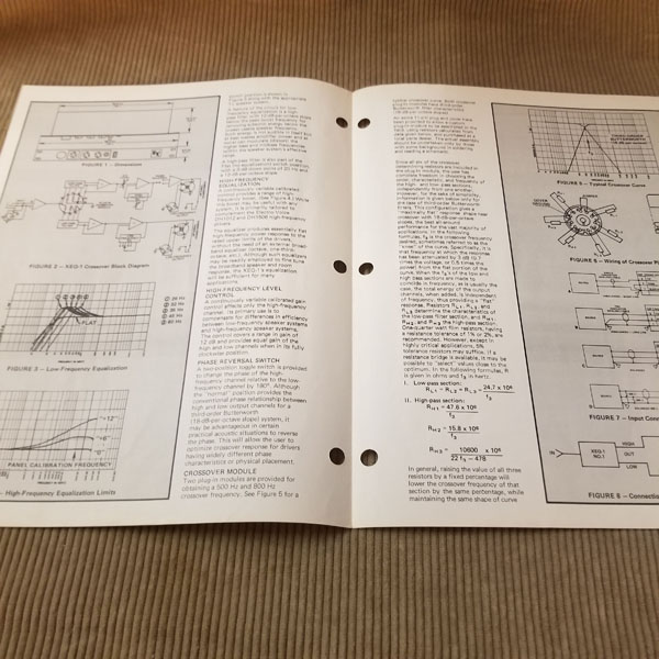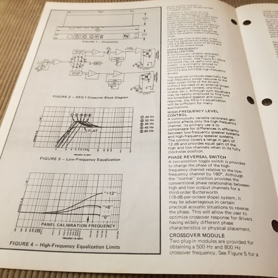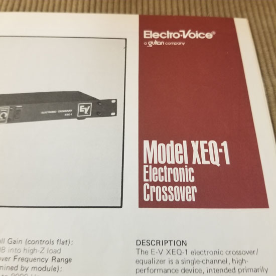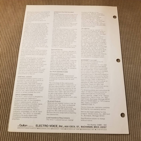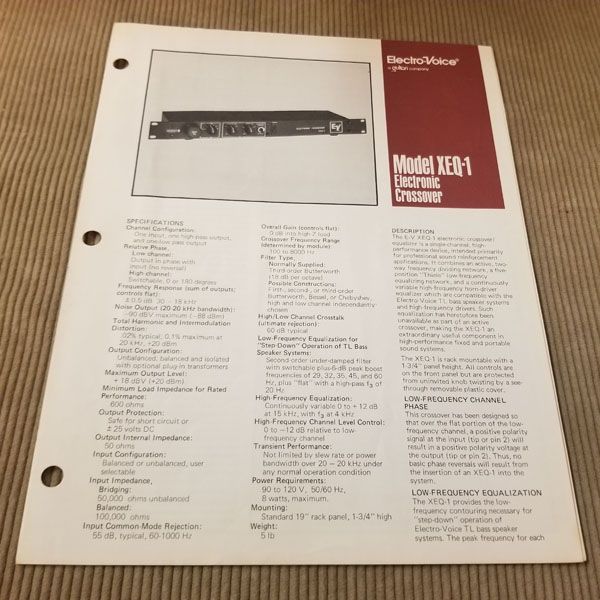 Original Vintage EV Spec Sheet Model XEQ-1 Electronic Crossover. 2 pages both sides printed. Part# 53689-924. Good condition