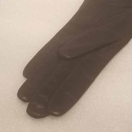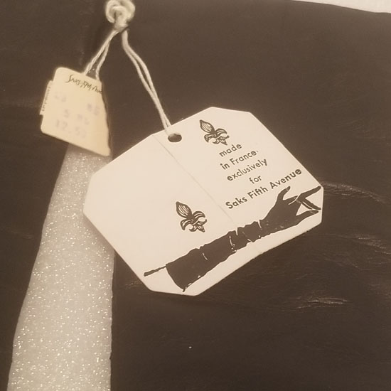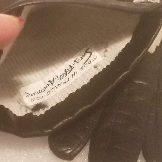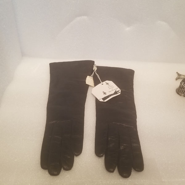 Vintage w/ tags Made in France for Saks Fifth Ave. leather long ladies dress gloves. Black color, size 6 1/2. Has 2 tags on them still, never worn. The lining is wool. around the tag on the inside the wool is separated from the tag a bit.