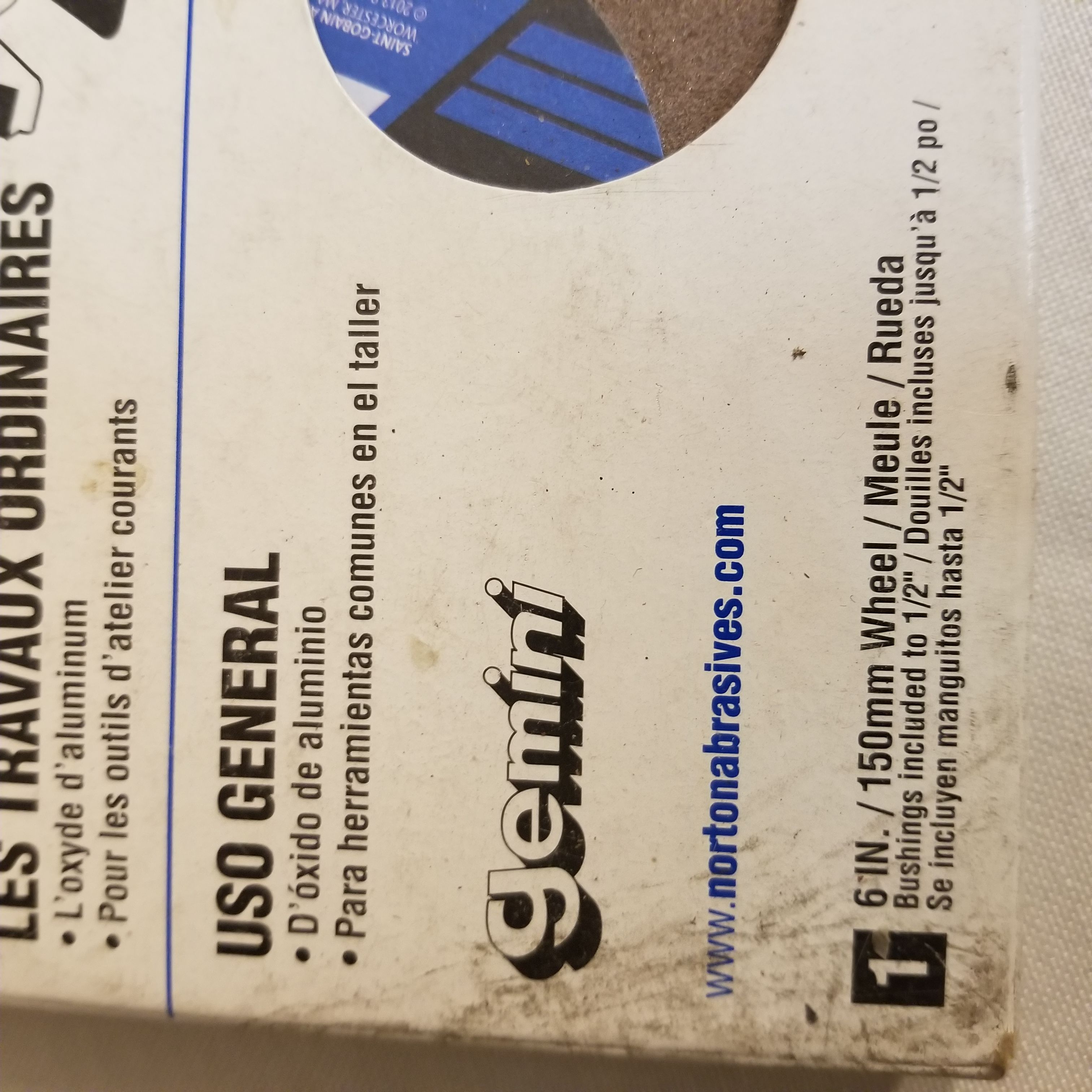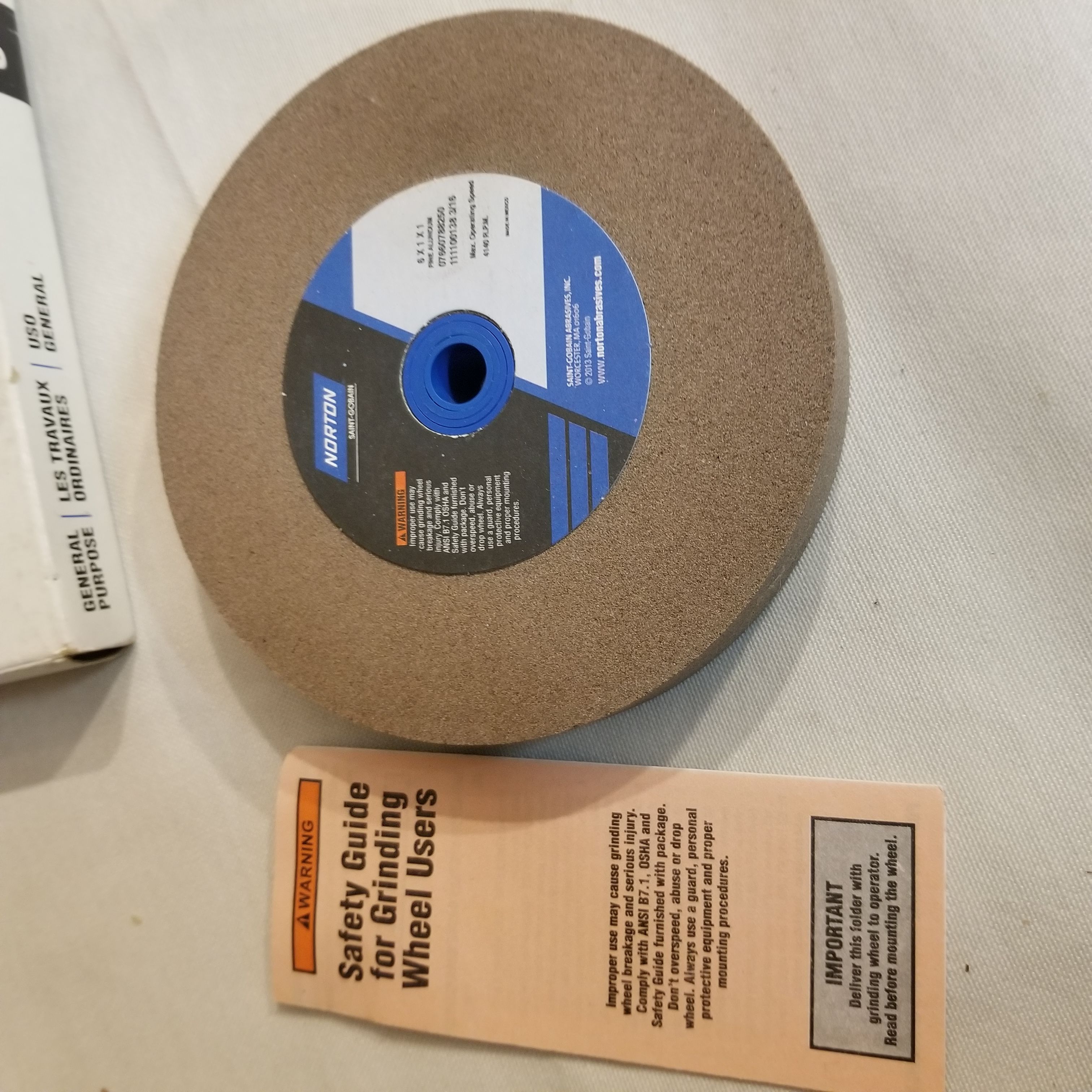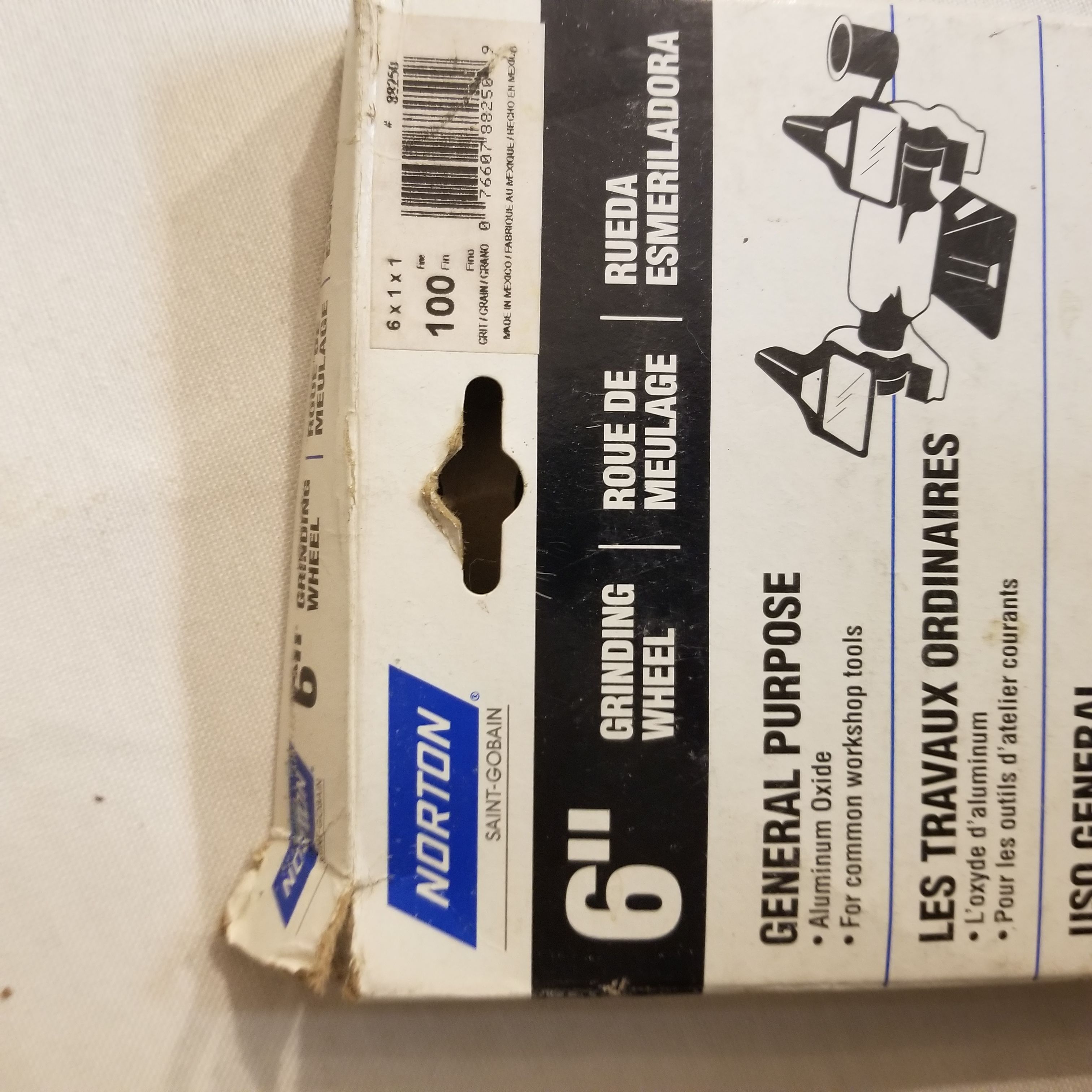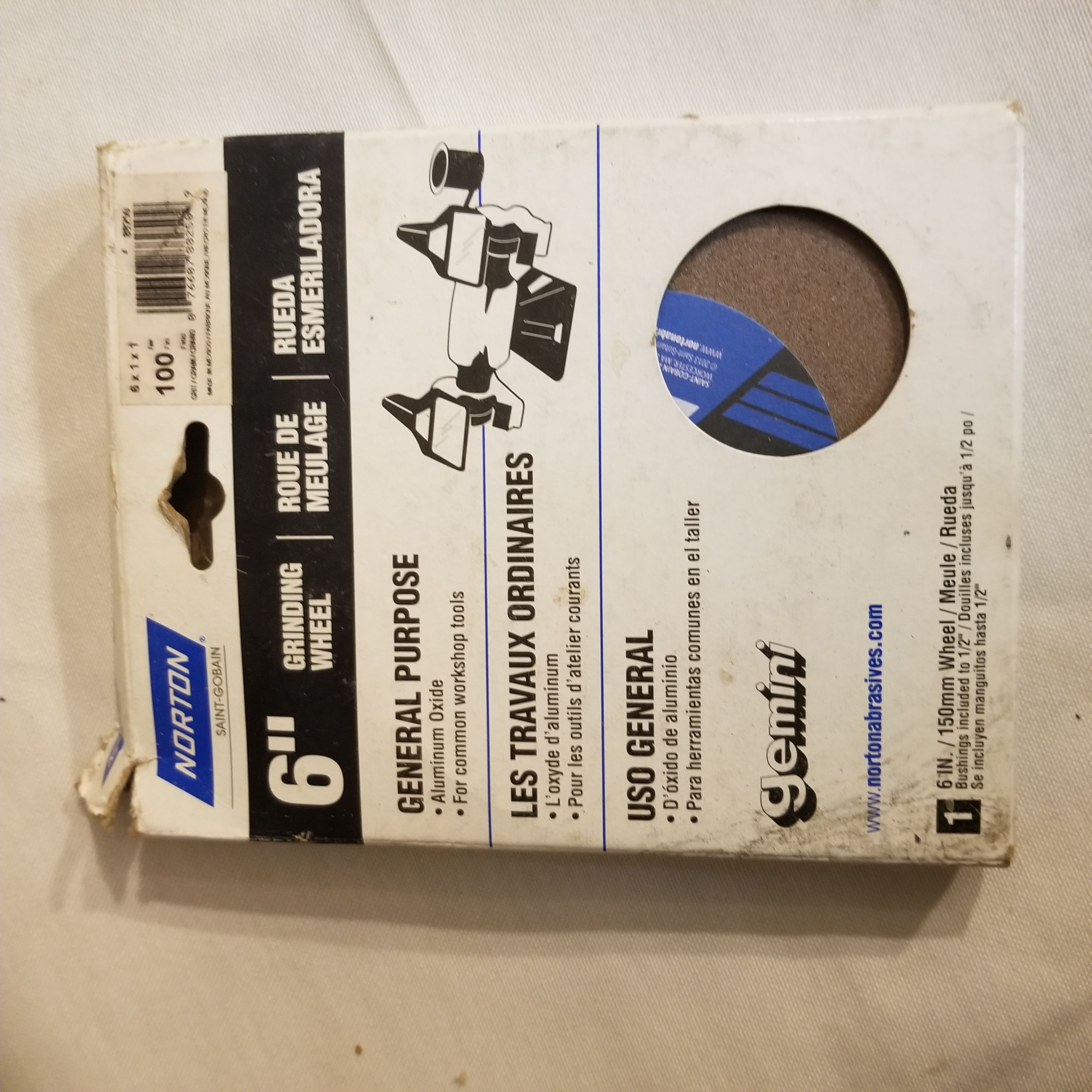 New Norton 6" General Purpose grinding wheel 6x1x1 100 gr. The box has a bit of wear but the wheel is new, very good.